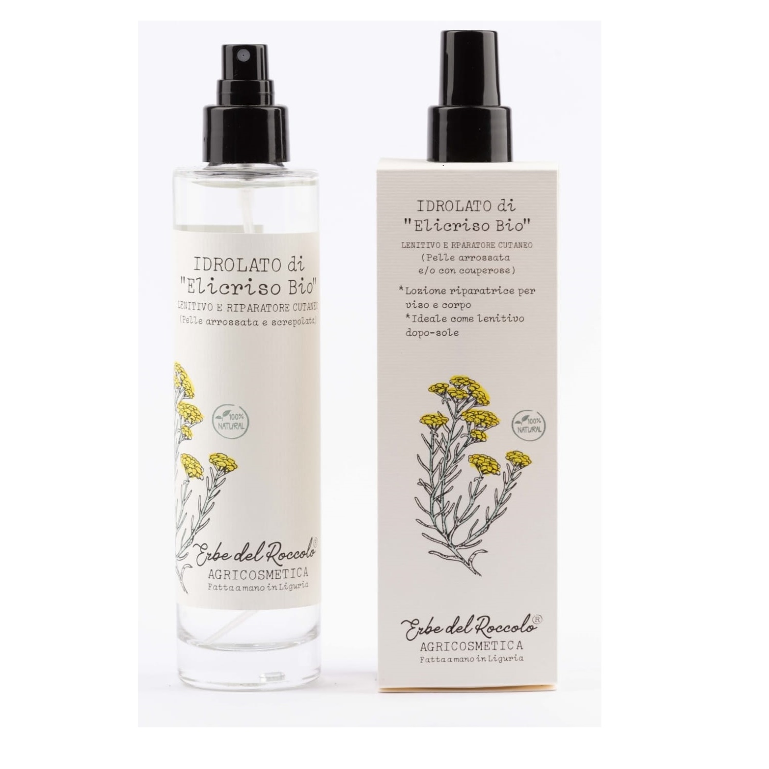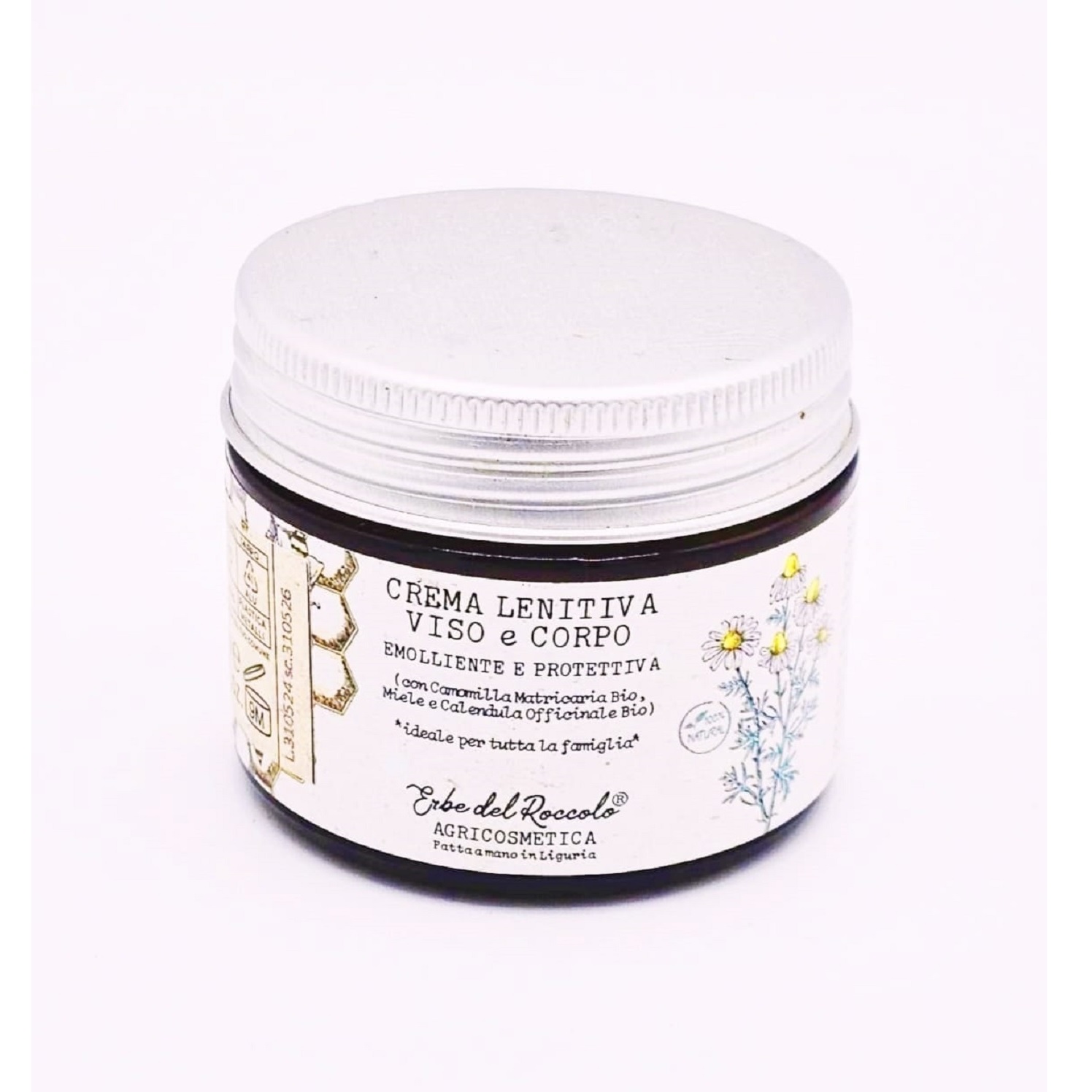 ist eine beruhigende und feuchtigkeitsspendende Creme, die für die Haut von Gesicht und Körper geeignet ist. Bio-Ringelblume, Extrakt der Kornblume, Olivenöl, Bio-Kamillenöl und Bio-Helichrysum-Hydrolat (Strohblume), das aus angebauten und verarbeiteten Pflanzen des Bauernhofs im Hinterland Liguriens auf 800 m über dem Meer gewonnen wird, angereichert mit Aloe Vera-Saft, Honig, Vitamine C und E.